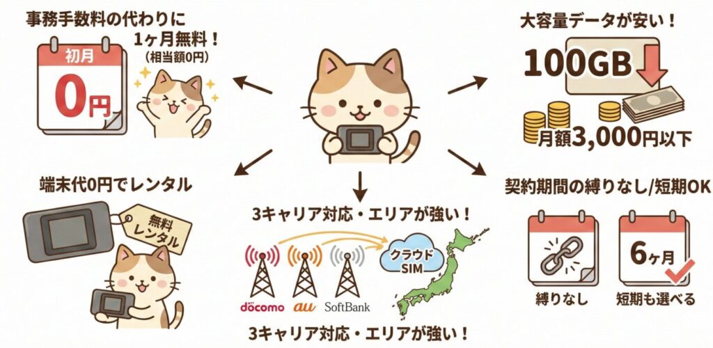 株式会社IoTコンサルティングが提供する「にゃんこWi-Fi」は、docomo・au・SoftBankの3キャリアに対応したクラウドSIMを採用したポケットWi-Fiです。