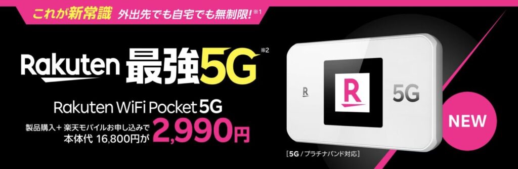 2026年3月2日より、楽天モバイルの【5Gエリア】に対応した最新モデル「Rakuten WiFi Pocket 5G」の販売が開始されました。発売記念としてプランと同時申し込みで16,800円 → 2,990円で購入可能です。なお、SIMタイプは「eSIM」の選択が必須となります。