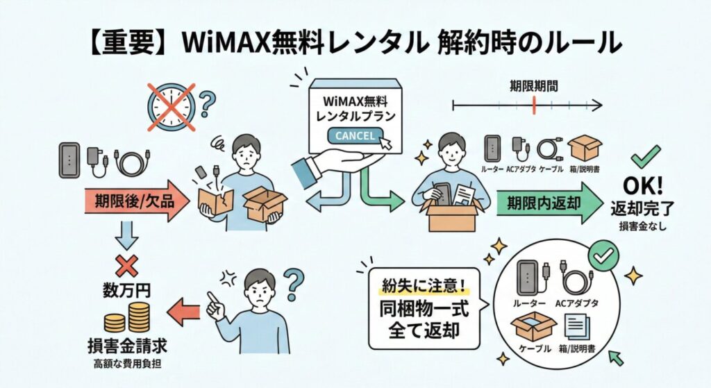 WiMAXの無料レンタルプランを選択した場合は解約時に返却が必ず必要となり、期限までに返却が行われないと損害金が請求されるため注意が必要です。