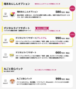 さらに、「丸ごと安心パック for ZEUS WiFi(月額999円)」という最上位の補償プランも用意されています。こちらでは、パソコン本体だけでなく周辺機器やソフトウェア、iPhoneなど、幅広いデバイスに関するトラブルに対応する総合サポートを受けることが可能です。