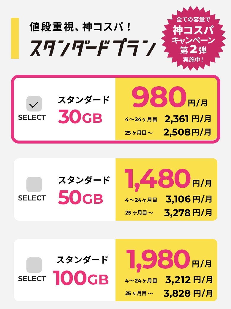 | 月額料金 (2年契約) | 980円〜 (4ヶ月〜2,361円) | 1,480円〜 (4ヶ月〜3,106円) | 1,980円〜 (4ヶ月〜3,212円) |