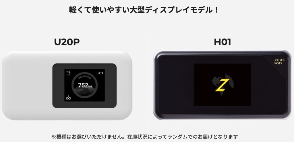 ゼウスWiFiで取り扱っているWiFi端末は液晶ディスプレイが採用された「H01」と「U20P」の2つの種類のモバイルルーターのいずれかを無料レンタルで提供する形となります。