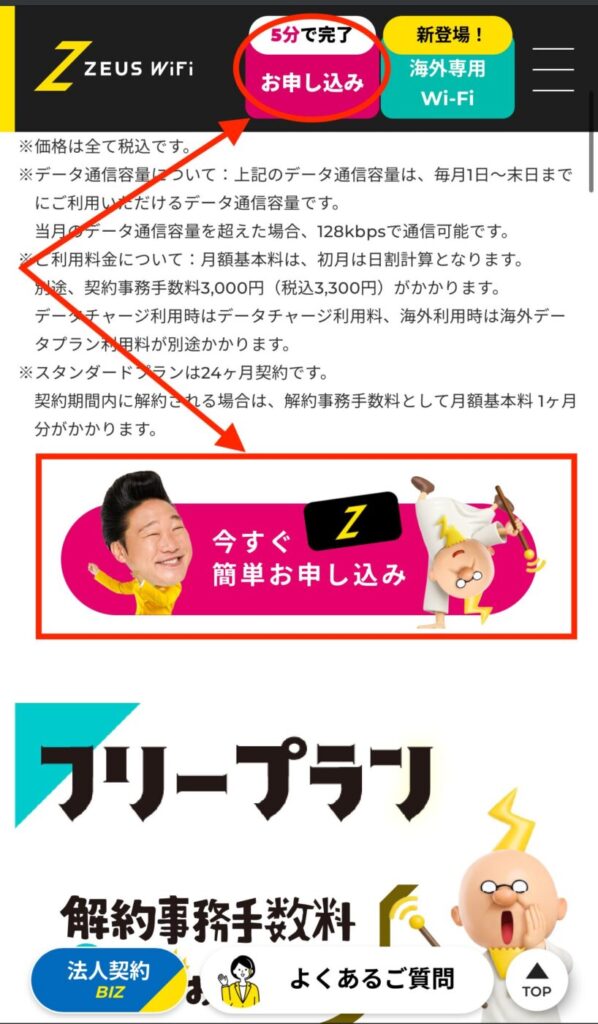 ZEUS WiFiの公式サイトへアクセスして「今すぐお申し込み」を押す