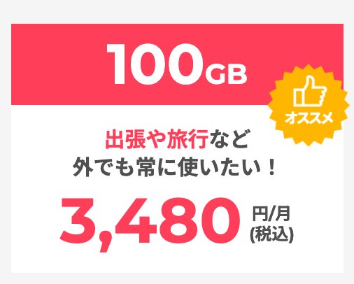 | 月額料金 | 2,480円 (30GB) 2,990円 (50GB) 3,480円 (100GB) 4,880円 (1日/10GB) | 3,480円 (30GB) 3,979円 (50GB) 4,980円 (100GB) 5,990円 (1日/10GB) | 2,480円 (20GB) 3,280円 (40GB) 3,880円 (100GB) |