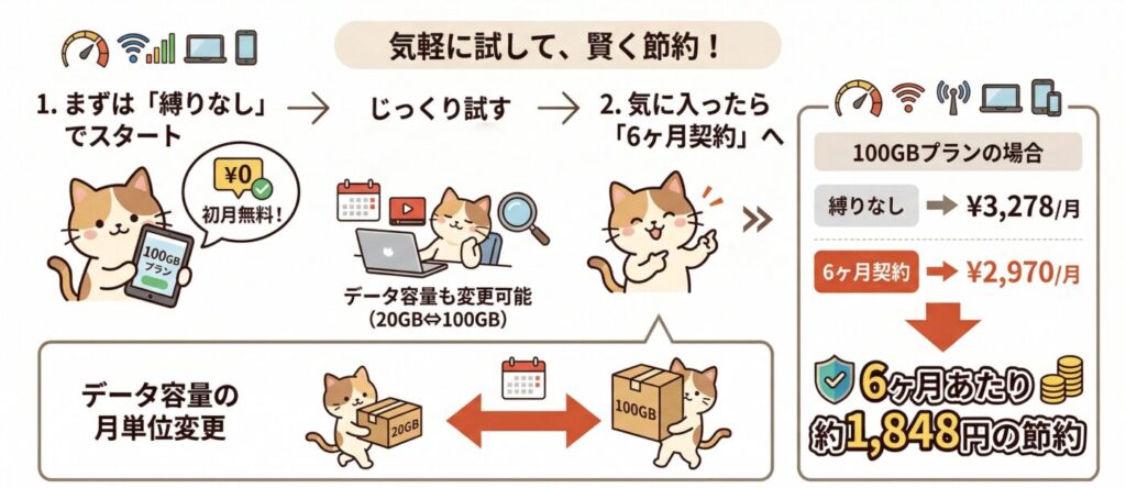 「初月タダで試して、続けると決めたら6ヶ月契約に切り替えてさらに安くする」という使い方ができるのは、にゃんこWi-Fiならではの強みです。20GB⇄100GBのプラン変更も月単位で柔軟に対応しています。